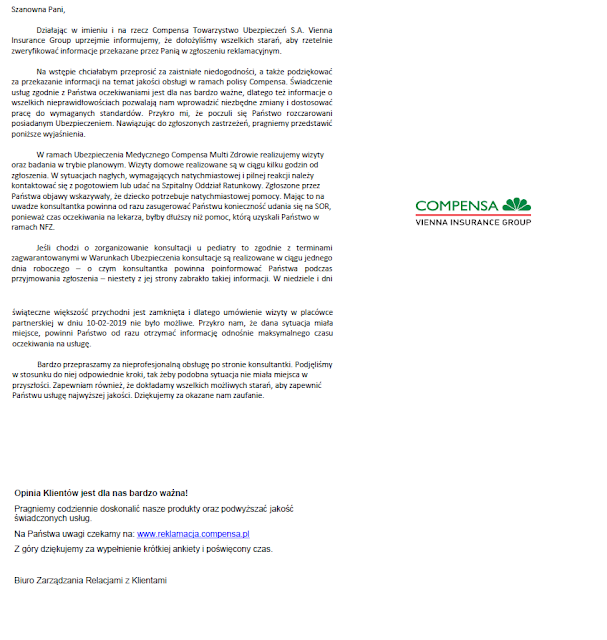 Nietrudno zgadnąć, że sytuacja nie zmienia się i dziecko trafia do szpitala na 3 dni. Jesteśmy zawiedzeni postawą firmy, której co miesiąc płacimy za iluzję poczucia bezpieczeństwa. Mija trochę czasu, kontaktuje się ze mną inna przedstawiciel Compensy z przeprosinami i informacją, że procedury zostały złamane, że pracownik popełnił błąd, bla bla bla…